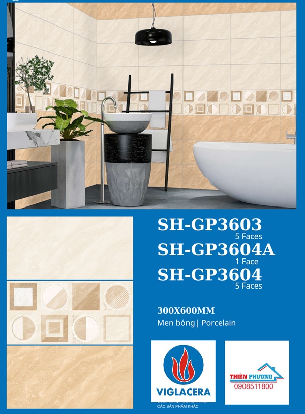 Gạch ốp lát SH-GP3604, kích thước 30x60cm dễ dàng thi công ốp tường ở nhiều khu vực dù diện tích lớn hay nhỏ. Gạch do thương hiệu Viglacera - nổi tiếng hàng đầu tại Việt Nam sản xuất.