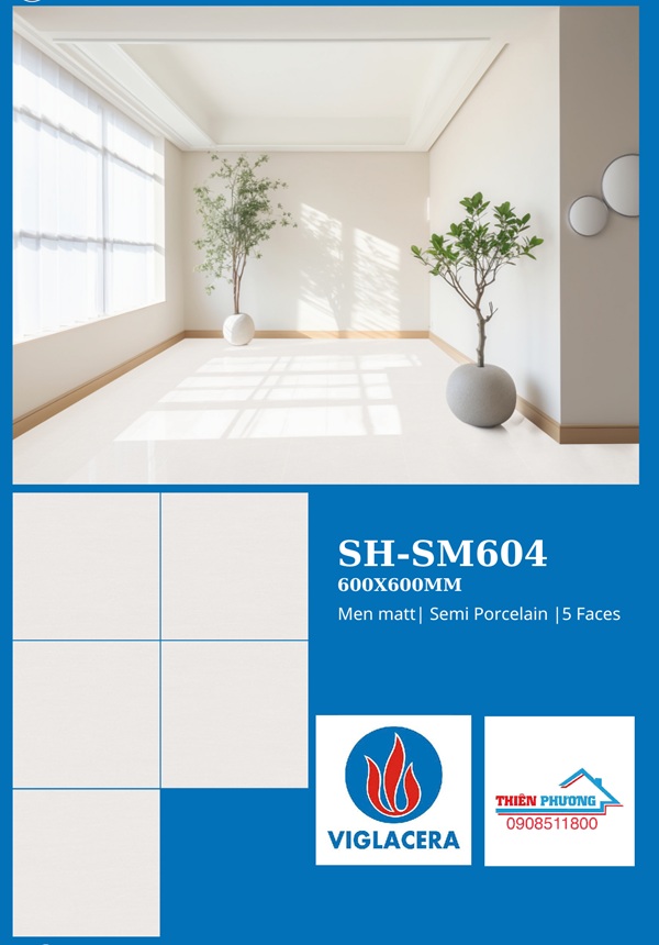 Gạch lát nền Viglacera SH-SM604 là mẫu gạch có họa tiết vân đá rất đẹp. Gạch có thiết kế tinh tế và đơn giản, kích thước gạch 60×60 rất được ưa chuộng lát nền tại phòng khách, phòng ngủ hay nhà bếp.